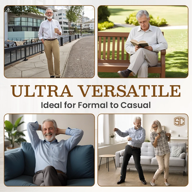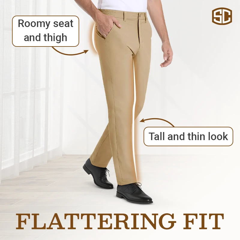 Avoid a frumpy or tight look with StrideComfy's elegant straight and classic fits